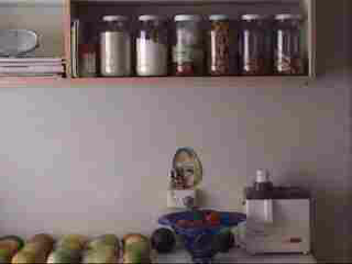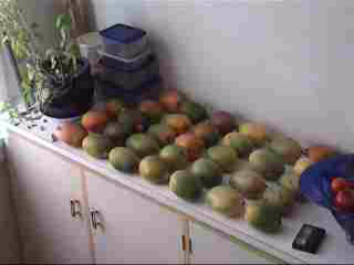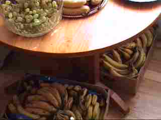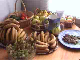We store our fruit on the table, under the table, in baskets. We like shelled nuts. They taste better than the other type and cracking them is fun! (We keep the greens in the fridge.) We use a glass jar with some rotting fruit in it and a paper cone to keep the fruit flies away (we release them in our garden). How does this work? Well, the flies can easily get in the jar through the paper cone, but they do not know how to get out! (Make sure to release them frequently, otherwise they will multiply in the jar. ) Julia loves peaches, zuccini noodles (minus avo), mangoes and other fruit. I love black-muscat grapes. We store the nuts in jars. (Our juicer is hardly ever used.) We buy bananas by boxes. |