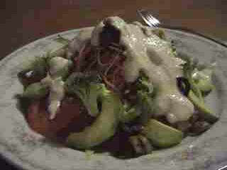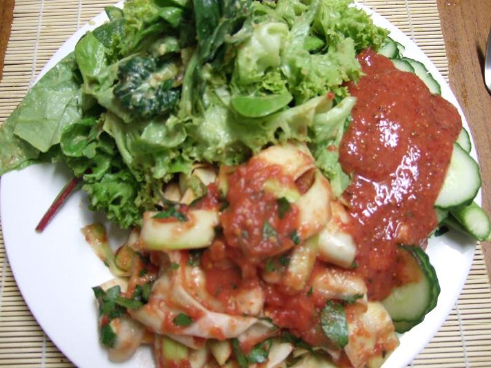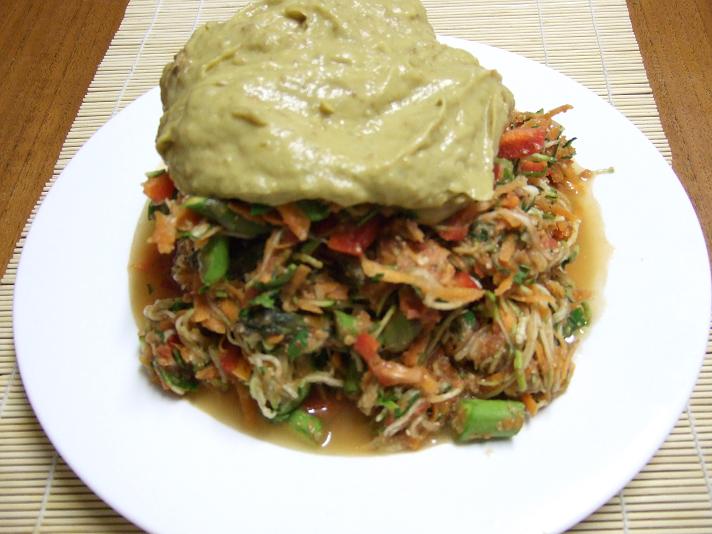 Using a peeler, slice 3-4 zuccini into thin slices (fettucini). Blend a handful of sundried tomatoes with 3 tomatoes. Toss the sauce and some chopped up parsley with the fettucini. Mix well, place on a. plate Next, make a salad dressing by blending avocado, juice of 1/2 lemon and 1 orange, 2-3 fresh dates. Place mixed greens on the plate and pour the dressing on top. Finally chop up some asparagus and cucumber. On top of those pour a dressing made by blending a cup of strawberries with 2 fresh dates. Serve! ![]() To make the "mountain with a cloud" below, follow these steps (serves two): Using spiral slicer, make spaghetti from 3-4 zuccini, and place in a large bowl. Also in the slicer, slice 1 cucumber. Then chop up up 1 carrot, 1 asparagus, 1 capsicum, and a bunch of parsley. Mix everything in the bowl, together with a sauce made by blending a handful of sundried tomatoes, 3 tomatoes, a small handful of pine nuts, and a bunch of basil. Place on a plate forming a mountain. On top of the mountain place a cloud made by blending 1 avocado, juice of 1/2 lemon and 1 orange, and 4 dates. Serve. ![]() |