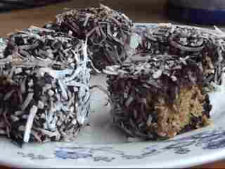 Make a sweet carob sauce by first blending 1/2 c raisins with carob (from 1 T to no more than about 1/2 c of carob, depending on how sweet/bitter you want it to be), and then adding 1-2 T coconut butter and blending till smooth. Cover chewies with the sauce and dip in grated coconut. Hint: I do it on a plate, using knife and my fingers. It can be quite messy! Refridgerate! ![]() (One of the lamingtons has been cut in half.) Sweet carob treats: ![]()